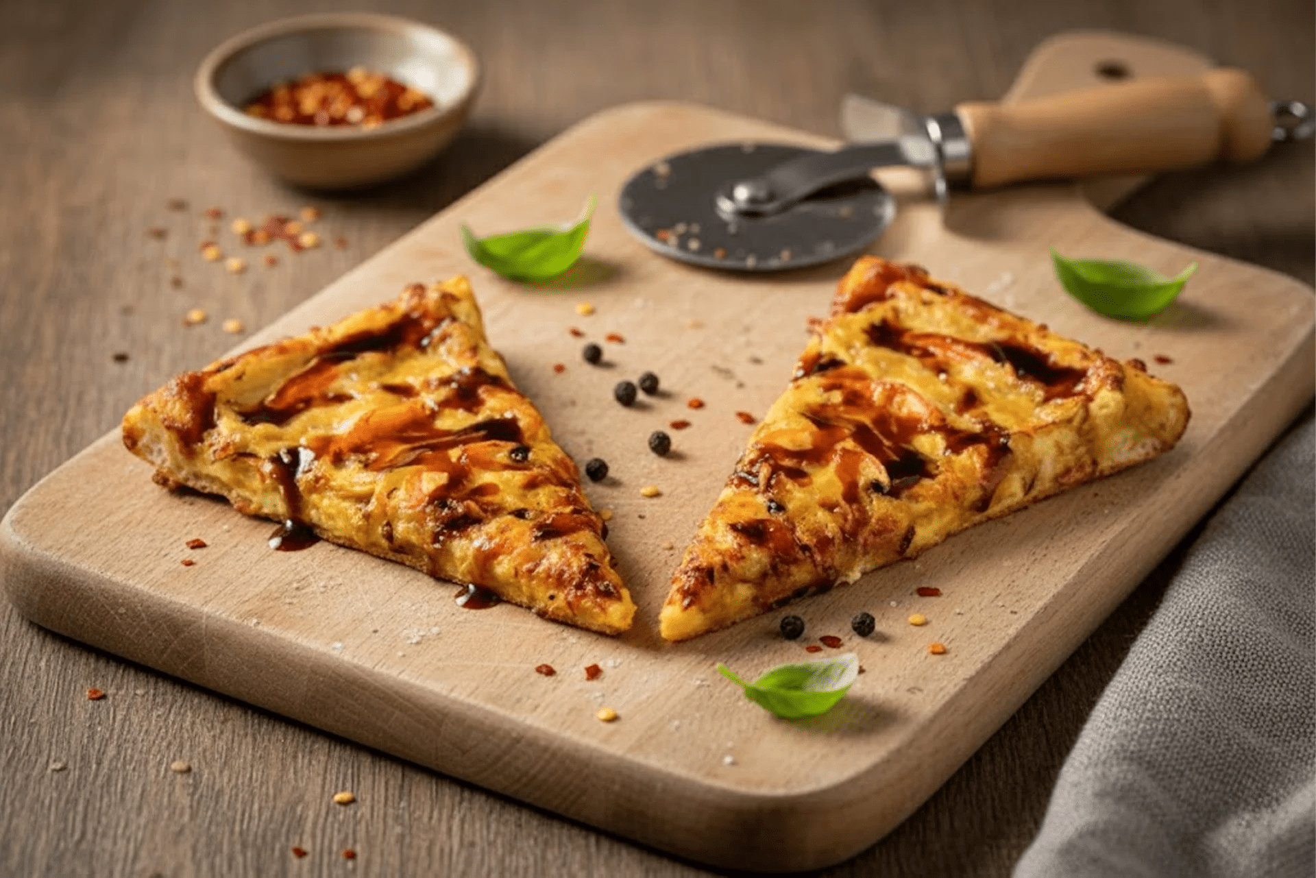 Croissant crust pizza with BBQ chicken, cheese, and smoky sauce for a sweet-savory flavor